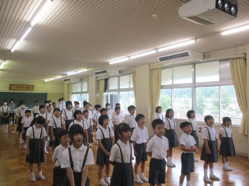 始業式では、校長先生から「2学期は『話を聞く姿』『進んでやる姿』をがんばりましょう。」とのお話がありました。子どもたちもペア・グループになって「相手を見て、終わりまで話を聞くとよいわけ」を考え、伝え合っていました。最後に5・6年生がしっかり自分の考えを発表している姿がすてきでした。2学期も、みなさんのたくさんのすてきな姿に出会えることを楽しみにしています。2学期も元気にがんばりましょう。