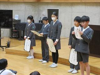 本日、「図工美術審査会絵画展」「読書感想文」「読書感想画」「歯と口の図画」「切り絵作品展」の表彰式を行いました。2学期、子どもたちはよく頑張りました。尚、「切り絵作品展」では、石川県より門前西・東小学校とも『学校賞』をいただきました。
