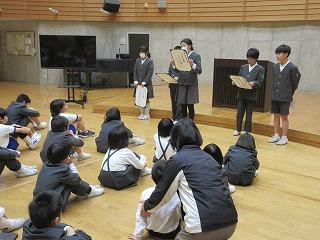 11月は、毎週水曜日に図書委員会が、低学年、中学年、高学年の3ブロックに分かれて読み聞かせをしてくれました。読み終わると、聞いていた児童からもたくさん感想が伝えられ、大変よい読み聞かせとなりました。図書委員会の皆さん、ありがとうございました。