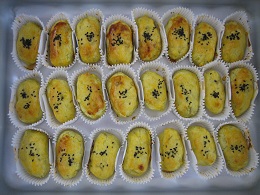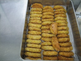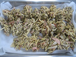 さつまいも、玉ねぎ、ハム、ひじきに塩とこしょうで味つけをし、小麦粉、米粉、卵で作った衣をつけて揚げました