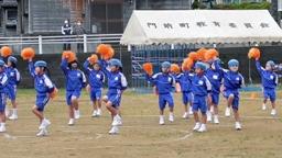 休憩後,「鼓笛演奏」を行いました。立奏(左写真)の後,行進して退場(中央写真)しました。雨が少しでも残っていたらできなかった種目なので,できて本当に良かったです。6月6日の禅の里パレードは延期となりましたが,延期ということはできるということなので,その時は立派な衣装を身にまとい,さらに上達した演奏をお届けします。次の「全校エビカニ玉入れ」は,児童達が大好きな種目です。これまでは低学年の種目だったため,児童は4年生になるとできなくなっていました(それでもテント前で一緒に踊っていた)が,今回は嬉しい復活となりました。勝負は赤の勝ちでした。