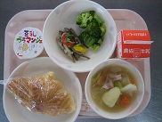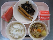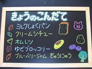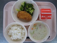 今日はフランス風のメニューを集めてみました。クロワッサンに子どもたちは大喜びでした。魚が苦手という子がちらほらいましたが、まるごと食べると栄養いっぱいだよと声をかけると、がんばって食べていました絵文字:四人