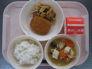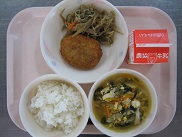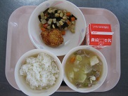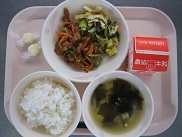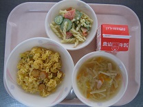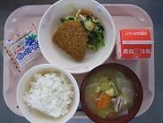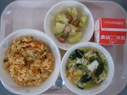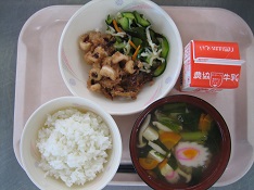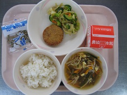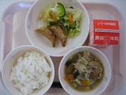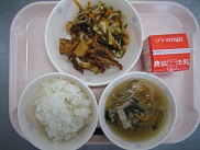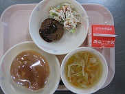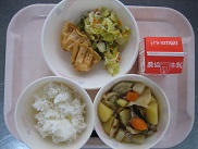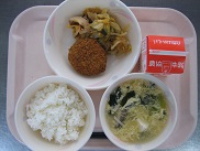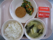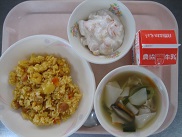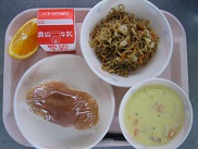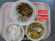 今日は韓国の料理、チャプチェを出しました。春雨に小松菜、卵、牛ひき肉、人参、しいたけ、たけのこを加えて作りました。ごま油がきいていました。イカメンチカツは、とても噛みごたえのあるかみかみメニューです。低学年の子もよくかんで食べていました絵文字:四人