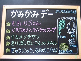 かみかみサラダは、さきいかをオーブンで香ばしく焼き、せん切りにした大根、にんじん、きゅうりと合わせて、マヨネーズやごま、塩、こしょう、うすくちしょうゆで味つけします。皮付きのさきいかで作ると、おいしくできます。今日は時間内に食べ終わる子も多く、全員残さず食べることができました絵文字:良くできました OK