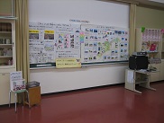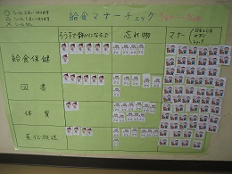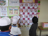 保健・給食委員会で、すきなきゅうしょくアンケートをとります。今日はランチルーム前の掲示板に、16枚の給食写真を貼り出しました。委員会で集計して、人気ランキングを出します絵文字:四人