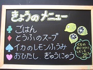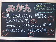 今日は今年2回めの門前産みかんを出しました。先月より黄色く色づいていたような気がします。風邪の予防になるから食べようねと声をかけました。あまずっぱくて美味しかったです絵文字:良くできました OKたくさん収穫してくださってありがとうございました。今日は、他にも、じゃがいも、白菜が門前産でした絵文字:ハート絵文字:ハート