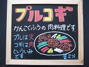 今日は、韓国風の肉料理のプルコギを出しました。韓国語でプルは火、コギは肉という意味です。 野菜やきのこも入っています。「プルコギも海苔もすごくごはんに合うよ!」と嬉しそうに言ってくれる子もいました