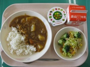 今日の献立は、カレーライス、ツナサラダ、野菜とくだもののゼリー、牛乳です。