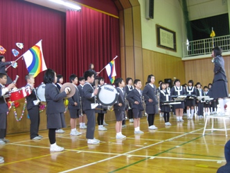 鼓笛引き継ぎでは3年生が加わった新鼓笛隊で「能登は門前寺の町出湯」と新曲「あまちゃん」を披露しました
