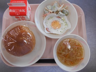 今日は、紙カップに半月に切ったハムを一枚一枚入れて、卵をのせ蒸しました。「卵の黄身が苦手~」と言いながらみんな食べて行きました。今日も、おいしかったですね。