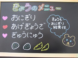 まだ水道が通常通りになる見込みがないため、残念ながら明日あさっての給食はおにぎりと牛乳のみとなります。ご了承お願いします。