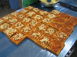玉ねぎ、ベーコン、ピーマンをバターで炒めてケチャップ、ベイシックトマト、ピザソース、塩、こしょうで味付けしたものをパンに塗り、チーズをのせて焼きました