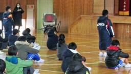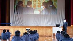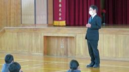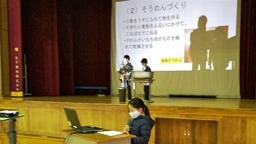この日の集会は,春を思わせる暖かい中で行われました。校歌,校長講話の後,生徒指導の田中教諭から,プレゼンテーションを活用した「みんなが笑顔の門前東小学校」という,とても大切なお話がありました。(校長講話の内容は写真下にあります。)