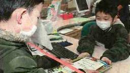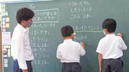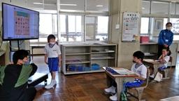 1年生と2年生は,4月から同じ教室で過ごすことになりました。そこで,今週は,算数で実際に複式での授業を経験してみることになりました。今回は,越渡先生が授業をし,小路先生が支援をします。児童たち,最初に複式での授業の進め方を教えてもらい(左写真),それから前(1年生)と後ろ(2年生)に分かれて授業を受けました。先生が一方の学年の所にいる時は,呼びたくても我慢する等,みんなよく頑張ってくれました。