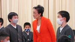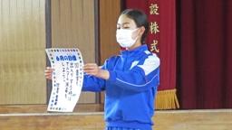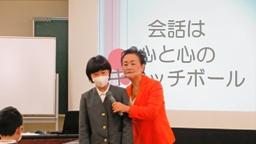 この日の集会は,フリーアナウンサーの横田幸子さんを講師にお迎えして行いました。横田さんは,ニュースキャスター等テレビの仕事を長年された後,現在は,各地の学校を訪問し,「言葉の力」について講演されています。この日も,そのお話でした。横田さんの,「言葉は刃。人は,自分の痛みには敏感だけど,他人を傷つけていることには鈍感である。」では,児童たちにとって思い当たることがあるようで,自分自身のこれまでを振り返って聞いているようなリアクションがありました。「会話は心と心のキャッチボール。」では,実際に児童10名にキャッチボールをしてもらい,上手だったペアに,その秘訣を聞きました。それは,まさしく人に対する時の言葉づかいで大切なことと同じでした。