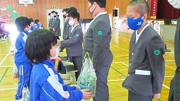 プログラム8番 1年「プレゼント渡し」 6年生への手作りの贈り物。喜んでもらえましたね。
