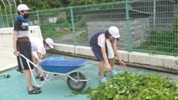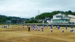 運動会が2週間後に迫ったこの日,保護者の皆さんのご協力を仰ぎ,運動場除草を行いました。児童たちもたくさん参加してくれました。おかげで運動場がとてもすっきりしました。手作業で中央部を,刈払機で周辺部の雑草を刈り取っていきました。7時からはじめ,8時を過ぎた頃には作業の終了が見えてきました。