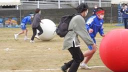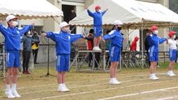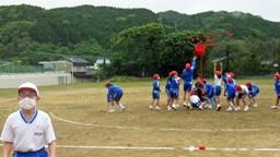 休憩後,「鼓笛演奏」を行いました。立奏(左写真)の後,行進して退場(中央写真)しました。雨が少しでも残っていたらできなかった種目なので,できて本当に良かったです。6月6日の禅の里パレードは延期となりましたが,延期ということはできるということなので,その時は立派な衣装を身にまとい,さらに上達した演奏をお届けします。次の「全校エビカニ玉入れ」は,児童達が大好きな種目です。これまでは低学年の種目だったため,児童は4年生になるとできなくなっていました(それでもテント前で一緒に踊っていた)が,今回は嬉しい復活となりました。勝負は赤の勝ちでした。