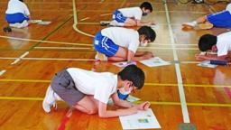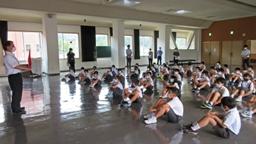 スポーツテストは8種目行います。そのうち,大きな集団で行うことが効率的である4種目について全校で行いました。ソフトボール投げは運動場で,上体起こし,反復横跳び,立ち幅跳びは体育館で行いました。