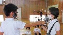 小学校の玄関では,マスクをした子どもたちが久しぶりに顔を合わせた先生に元気にあいさつし,手を消毒した後,自宅での検温を記録した用紙を見せていました。