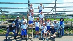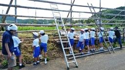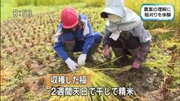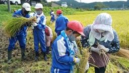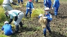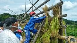 本校では長年稲刈り体験を続けてきましたが,2年前から田植えや収穫祭(新米を食べる会)も始め,本格的な米作り体験を行っています。昨年からは,はざ作りも始めました。これらの体験を通して,地域の産業(米作り)について学ぶだけでなく,食べ物を作って下さっている方々への感謝,食べ物を残さずに食べる姿勢なども身につけてほしいと考えています。