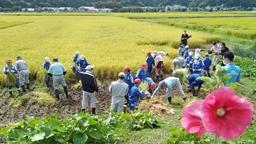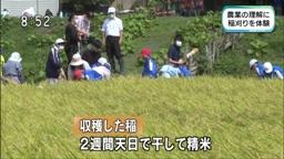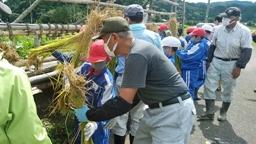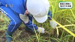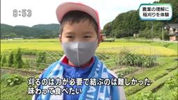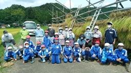 田植えから4ヶ月と少し。稲は立派に生長し,児童が戻ってくるのを待っていました。中橋代表をはじめとする「たかねをクラブ」の方々もそれは同じ。児童のためにいろいろな準備をして待って下さっていました。これまでは5年生だけで来ていましたが,複式が始まったことから,今年は4年生も参加。奮闘しました。しかし児童たちにとって一番難しかったのは,稲を藁で縛ることでした。これが緩いと,稲が稲架から落ちてしまいます。児童たち,真剣に縛り方を習い,一生懸命に縛っていました。ある程度収穫したら,残りはコンバインの出番です。全員が交代で体験させていただきました。お世話下さった宮崎さん,ありがとうございました。今日感心したことは,児童たちの多くが,自分の家の米作りを手伝っていることでした。皆,嬉々として,手伝っている内容を話してくれました。お世話下さった「たかねをクラブ」の皆さん,ありがとうございました。9月27日の「新米を食べる会」も楽しみにしています。当日は,よろしくお願いいたします。