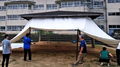 近年,悲しい姿を見せていた百葉箱。特別支援教育支援員の小松さんが,授業のない今を活用し,修理して下さいました。写真左側面の板は,全て新規張り替え。見事な出来映えです。