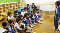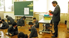 入学式は来賓の方々をお招きできず残念でしたが,ランドセルカバー贈呈式には来ていただくことができました。門前交番の広橋嘉弘所長さんと,交通安全協会の柴田芳治さんです。広橋所長さんから,このランドセルカバーがどのように役立つのかお聞きした後,柴田さんからランドセルカバーをいただきました。皆さん,交通ルールをしっかり守り,事故に遭わないように気をつけてください。