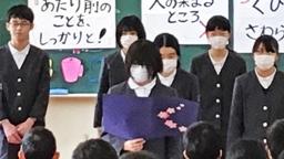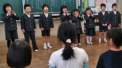 この日が,1~6年生がそろって登校する最後の日。臨時全校集会を行い,生徒指導主事,保健主事,校長が,それぞれの立場で,臨時休校中のことについて,児童に大切なことを伝えました。表彰や4年生の学年発表があった後,在校生と卒業生とのお別れの式を行いました。卒業式で行うはずだった「別れの言葉」です。練習時間がとれなかったため,互いに代表児童同士での挨拶となりましたが,互いに相手への感謝の言葉とエールが続く,素敵な時間となりました。