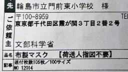 令和2年4月10日,文部科学省では,学校再開に向けた支援の一環として,全国の小学校・中学校・高等学校・特別支援学校・高等専修学校等の児童生徒及び教職員に対して,計2回(4月中と5月以降とで各1回),布製マスクを1人1枚行き渡るよう配布することとし,第1回については,4月13日(月)以降,日本郵便の配達網により順次各学校に直接配布を始めました。そして本日,本校にもそれが届きました。児童には5月15日(金)の家庭訪問の際に,児童学校預かりの児童にも,同日学校で渡します。よろしくお願いします。