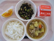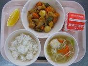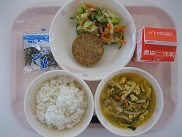 今日は1学期最後の給食でした。夏野菜をたくさん使ったカレーにしました。なすと、ピーマン、いんげん、かぼちゃは一手間かけて素揚げにしたので、コクと甘みがUPして美味しかったです。