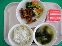 豚肉はお肉の中でも、疲労回復に役立つビタミンB1が多いです。今日は拍子木切りに切った豚肉を揚げて、甘辛いたれをからめました。こどもたちが大好きなメニューです絵文字:四人