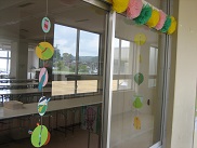 ランチルームにエアコンが入って、今年から快適な給食時間を過ごせるようになりました。今日はドライのスイッチを入れてみました。夏場でも食欲が落ちることなく、しっかり食べてくれるといいですね。ランチルームの窓には、切り絵が得意な先生に作って頂いた、モビールを飾りました。たべものやキッチングッズの切り絵がゆらゆらゆれて、とってもかわいいです絵文字:星絵文字:良くできました OK