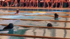5年以下女子25mバタフライ 4年Kさん(中央写真1レーン)34秒9(5位),5年Mさん(中央写真2レーン)34秒5(4位),5年Hさん(中央写真3レーン)24秒9(2位),4年Tさん(中央写真6レーン)38秒7(6位)