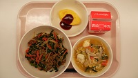 今日は人気メニュービビンバでした。お肉と野菜がたくさんとれます。キムチスープも具だくさんでおいしかったです