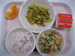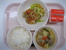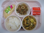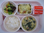 とうふのカレー煮は、木綿どうふ、ひき肉、玉ねぎ、たけのこ、にんじん、小松菜を使って和風のカレーに仕上げてあります。ごはんに合うので、おかわりする子もたくさんでした。石川県産のさつまいもを使ったクレープもおいしかっったです