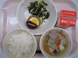 今日の豚汁はさつまいもの甘みがでていました。おひたしもみんな残さず食べました