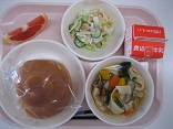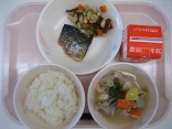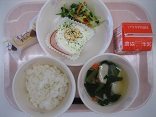 今日はしらたま汁に使った地場産の小松菜が新鮮でおいしかったです。ごま酢あえもさっぱりとおいしかったです。おもちが苦手だという子が何人かいましたが、がんばって食べていました