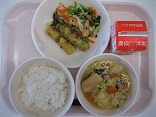 今日のカレーはシーフードでした。お肉のカレーの方が人気がありますが、たまにはシーフードのカレーもいいですね。海藻サラダの方もみんな残さず食べました