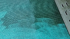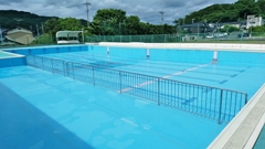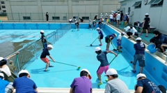 プールの季節到来です。少し涼しいというプール掃除にはうってつけの天候の下,3~6年でプール掃除を行いました。児童の掃除の前に,午前中のうちに職員であらかじめ落ちにくい汚れを落としておきました。今回は,高圧洗浄機を使い,これまで落ちなかった長年の汚れを落としました。プールサイドが久々に美しさを取り戻しました(左写真)。