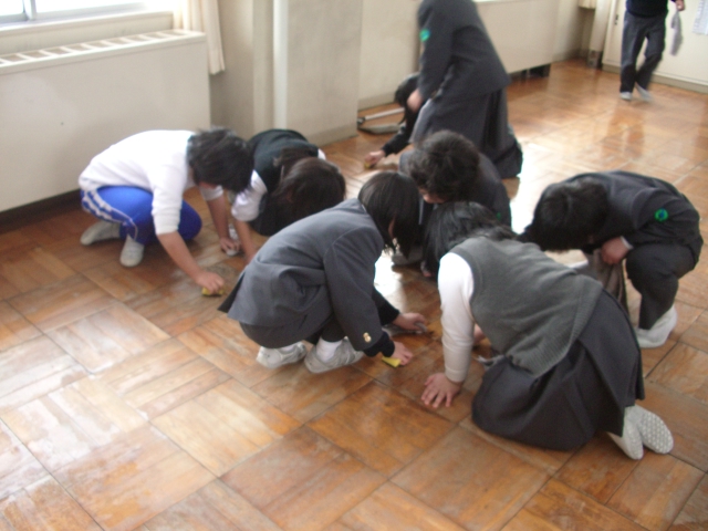 ワックスがけの前の汚れとり、水拭き掃除を行いました。みんないっしょうけんめいに掃除をしました。