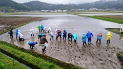 これまで本校の5年生は,毎年秋,たかねをクラブの方々にお世話していただき,稲刈りと稲架干しを体験してきました。しかし,「稲刈りのお手伝い」をしてはいても,自分たちで作ったお米の収穫をする喜びまでは感じることができてはいませんでした。そこで今年は,門前支所とJAにご協力をお願いし,「いしかわ田んぼの学校推進プロジェクト事業」として,田植えを行うことになりました。この日は霧雨が時折降る程度の,田植えをするには絶好の涼しい日。高根尾地区の田んぼで,待望の田植えを始めました。9時40分,中橋さんから田植え作業の説明をお聞きし,児童の意欲も最高潮。10時,作業開始。最初,児童は,田んぼの軟らかい土に大苦戦。長靴が動かなくなり,歩くだけでも大変でした。それでも徐々に上手に歩けるようになると,作業も軌道に乗ってきました。