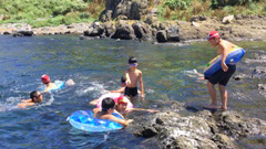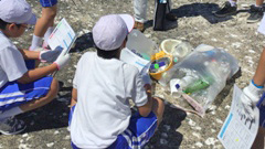 好天に恵まれ,8名全員揃って,七ツ島へ出かけました。国土交通省の「のとかぜ」で,1時間程かけて到着しました。入江には,たくさんの漂着物があり,はじめにそれらを回収する作業を行いました。漂着物調査を通して,国外から流れてくる物もあるけれど,6割は国内から出たゴミであることを学びました。その後,水着に着替え,磯で海水浴を楽しみました。アメフラシを見つけて触れている子,船の先からの飛び込みにチャレンジする子,浮き輪でのんびりする子など,思い思いに楽しみました。とても充実した体験学習ができました。金沢港湾整備事務所の皆さん,ありがとうございました。(相神)