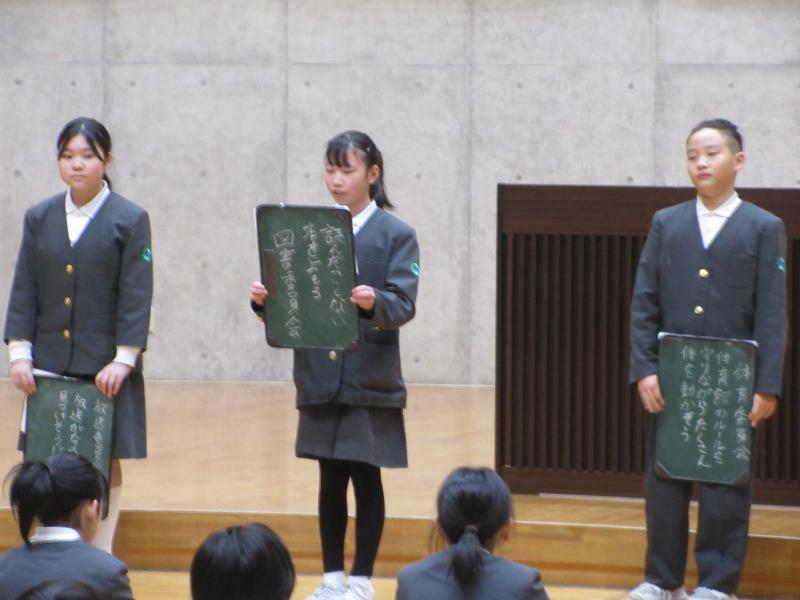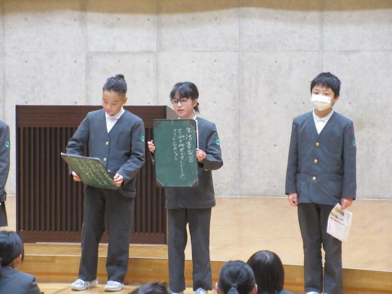 児童集会が行われ、今月からは副委員長の5年生が生活目標や委員会からのお知らせをしました。全校の前で緊張気味でしたが、大きな声でしっかりと発表できました。6年生に向けて、成長している5年生です!