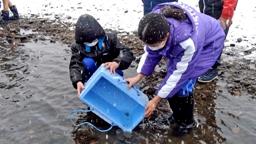雪がちらつく中,今年も八ヶ川へヤマメの放流に行ってきました。児童は,昨年から一人につき卵二つずつ担当し,稚魚としてひとり立ちできるまで育ててきました。そしてこの日が,お別れとなる「放流の日」でした。昨年はかなりの数の稚魚が途中で死んでしまいましたが,今年はほとんどの児童が二匹とも無事育てることができ,もしものために職員で育てていた稚魚の出番はほとんどありませんでした。児童たちは,「元気でね」など,思い思いのお別れをしました。きっといつか,大きくなって戻ってきてくれることでしょう。職員の育てたヤマメも,児童会代表の手で,無事放流してもらうことができました。