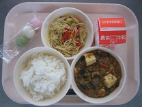 学校の桜も満開です。今日は花見のおだんごを出しました。ビーフンは、ちゅるちゅるした食感が美味しいのか、おかわりしている子もいました絵文字:四人