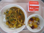 今日は1学期最後の給食でした。カレーには、能登産のイカと野菜をたくさん使いました。なす、ピーマン、かぼちゃ、グリーンアスパラガスは一度素揚げにしました。味にコクが出て、美味しかったです。