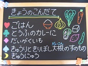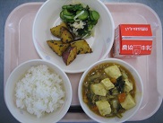 今日は秋の味覚「さつまいも」を大学芋にしました。水飴、さとう、しょうゆでたれを作り、仕上げに黒ごまをふってあります。とうふのカレー煮は和風の味つけで、ごはんによく合います。おかわりしている子たちがいました絵文字:四人