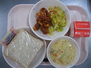 ちょっとスパイシーなイカのチリソースですが、子どもたちは大好きなようです。「全然辛くなかったよ!」という1年生もいました。キャベツとコーンのソテーも甘みがあって、おいしく野菜たっぷり食べられました絵文字:良くできました OK