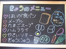 今日は半月型の厚切りハムに、衣をつけて揚げました絵文字:食事 給食 胚芽入りの食パンにはメープル風のシロップをつけて食べました絵文字:四人今日も残食ゼロでした絵文字:良くできました OK絵文字:良くできました OK